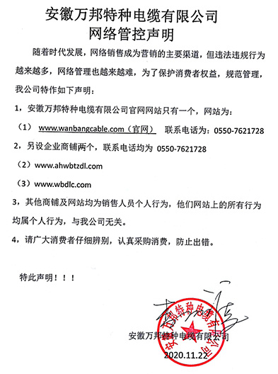 鄭重聲明:安徽萬邦特種電纜有限公司官方網站為:www_wanbangcable_com.zjsyjx.cn,除此之外無任何子網站或合作網站,其余均為假冒偽劣。電話:0550-7621728 13485756353 地 址:安徽省天長市滁州高新技術產業開發區經四路29號
